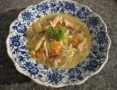 Das Fleisch wieder in die Suppe geben, alles gut mit der Hühnerbrühe abschmecken und noch einmal kurz aufkochen.