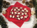 Die sehr gut gekühlten Platten mit einem scharfen Messer in kleine Rauten oder Rechtecke schneiden.